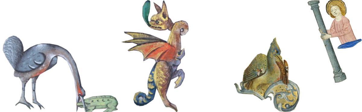 These creatures inhabit the margins of three Books of Hours, BOH 136, ff. 45, 47 (details), Northern France (Rouen), c. 1490-1510; BOH 102, ff. 16, 31, 87 (details), France (Paris), c. 1490; and BOH 94, ff. 1v, 44 (details), Eastern Netherlands (probably Zwolle), c. 1470-1480