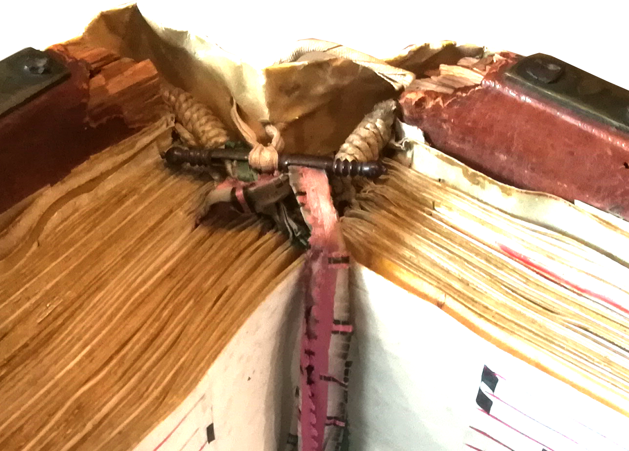 It also includes a very long note dated 1798, describing how it was updated and re-bound. This is fascinating evidence for how long it was in active use. It is bound in massive wooden boards covered with leather, armored, as was customary, with metal fittings. Its beautiful bookmark, made of metal and ribbons, still survives in the volume.