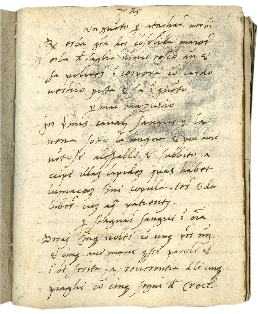 Open the book to its initial pages, and it appears to be just that, a book of medical and veterinary recipes. Compilations of technical and medical recipes like this one, known as books of secrets, abounded in the sixteenth century, circulating in manuscript and in print. The recipes here tend to be fairly brief and practical. Bitten by a cat? Mix galbanum (a bitter resin), black pitch, and gelding fat to make an ointment. Suffering from a dry catarrh? Bring a pound of apples to a foaming boil, remove from the flame and let it cool, and then stir in ground rosemary flowers, nutmeg, and a quantity of cinnamon and cloves until completely incorporated. Then take a chestnut-sized dose in the evening and morning. And, presumably, enjoy that the treatment can double as a tasty snack.
