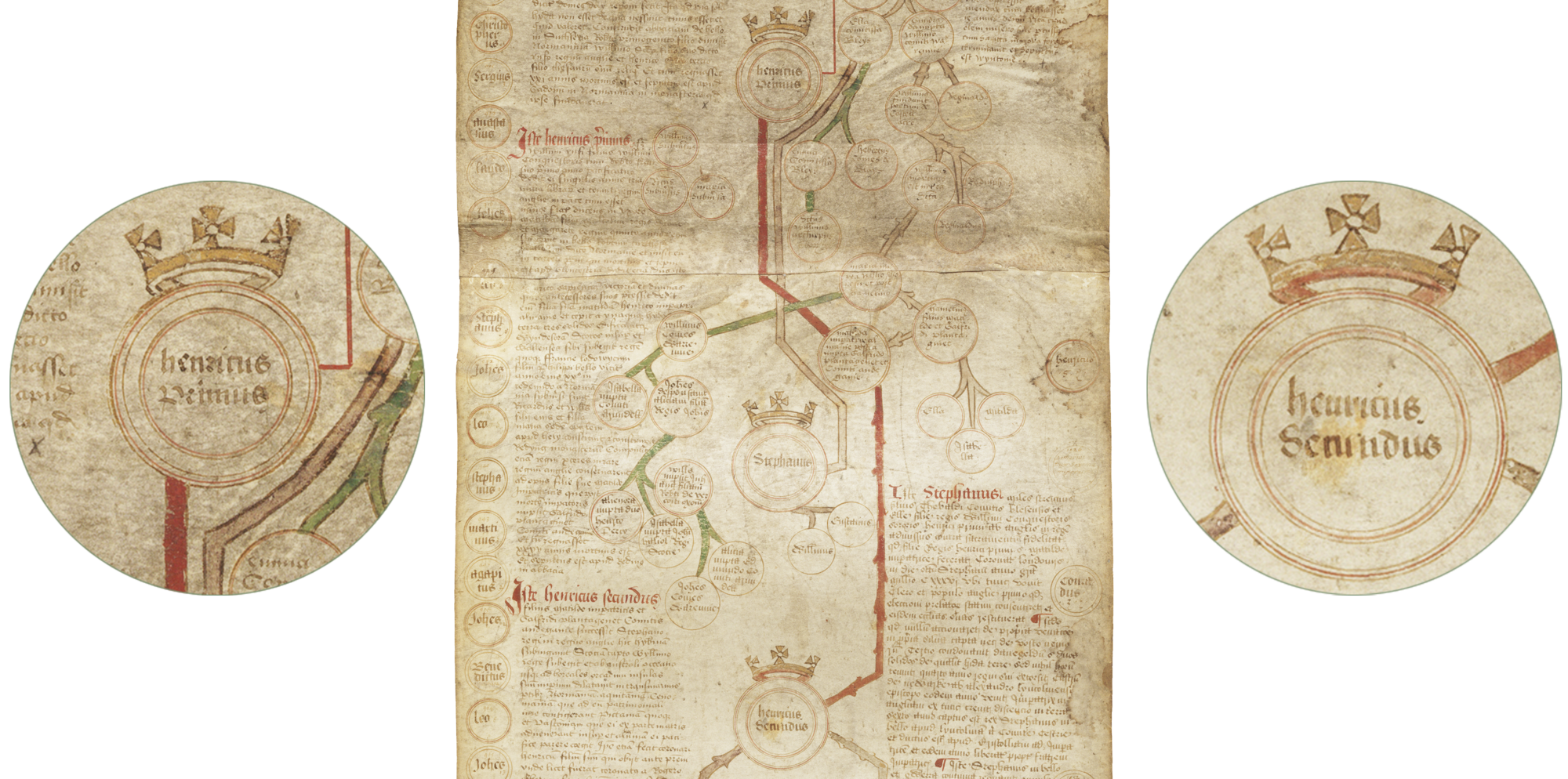 The red line snaking around Stephen links the prior king, Henry I, to his grandson, Stephen’s successor, Henry II, TM 840, membranes 8 and 9 (details)