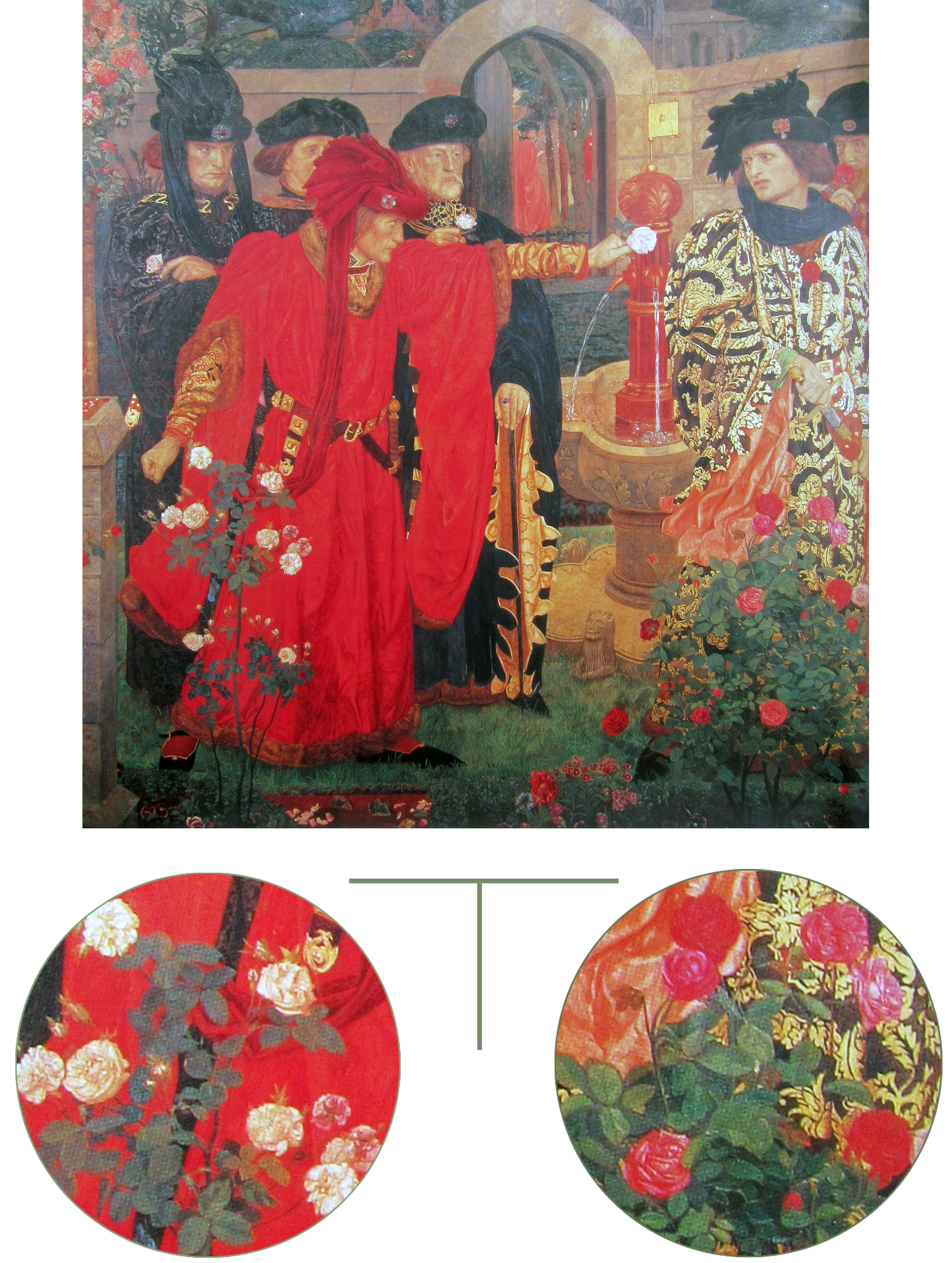 Members of the Lancastrian and Yorkist factions pick roses to indicate their allegiances in Henry Payne’s 1908 painting of a scene from Shakespeare’s Henry VI, The Plucking of the Red and White Roses in the Temple Garden, London, Palace of Westminster