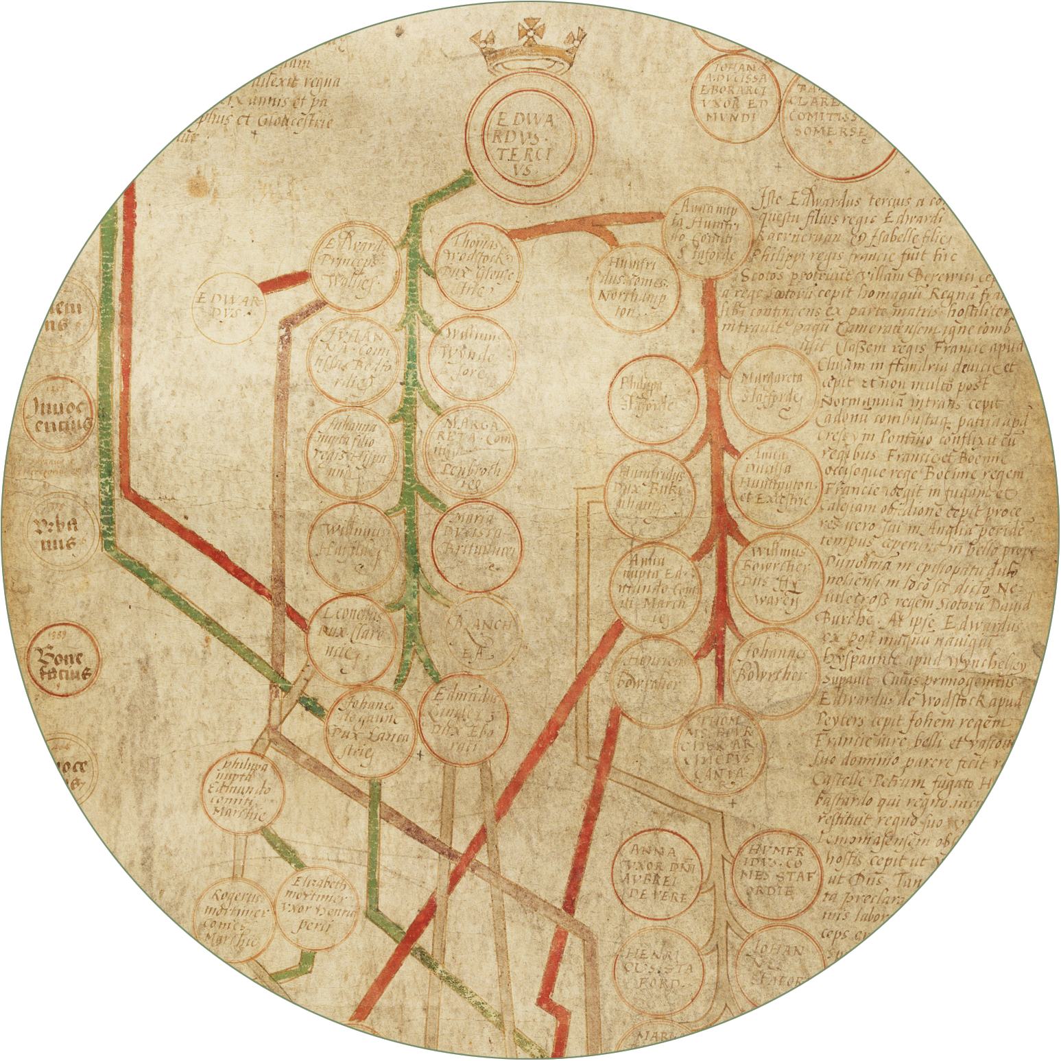 The bends and twists of the colored branches – representing lines of descent – underscore the movements of different families in and out of power.  But the format of the roll, with membrane after membrane of large crowned roundels proceeding down the center of the page, creates the impression of continuity where there was none necessarily to be found.  The man whose crowned roundel appeared at the foot of this roll would appear as the rightful, even inevitable, king and the latest in a series of great names that include Arthur, Alfred the Great, and, more recently, Edward III.