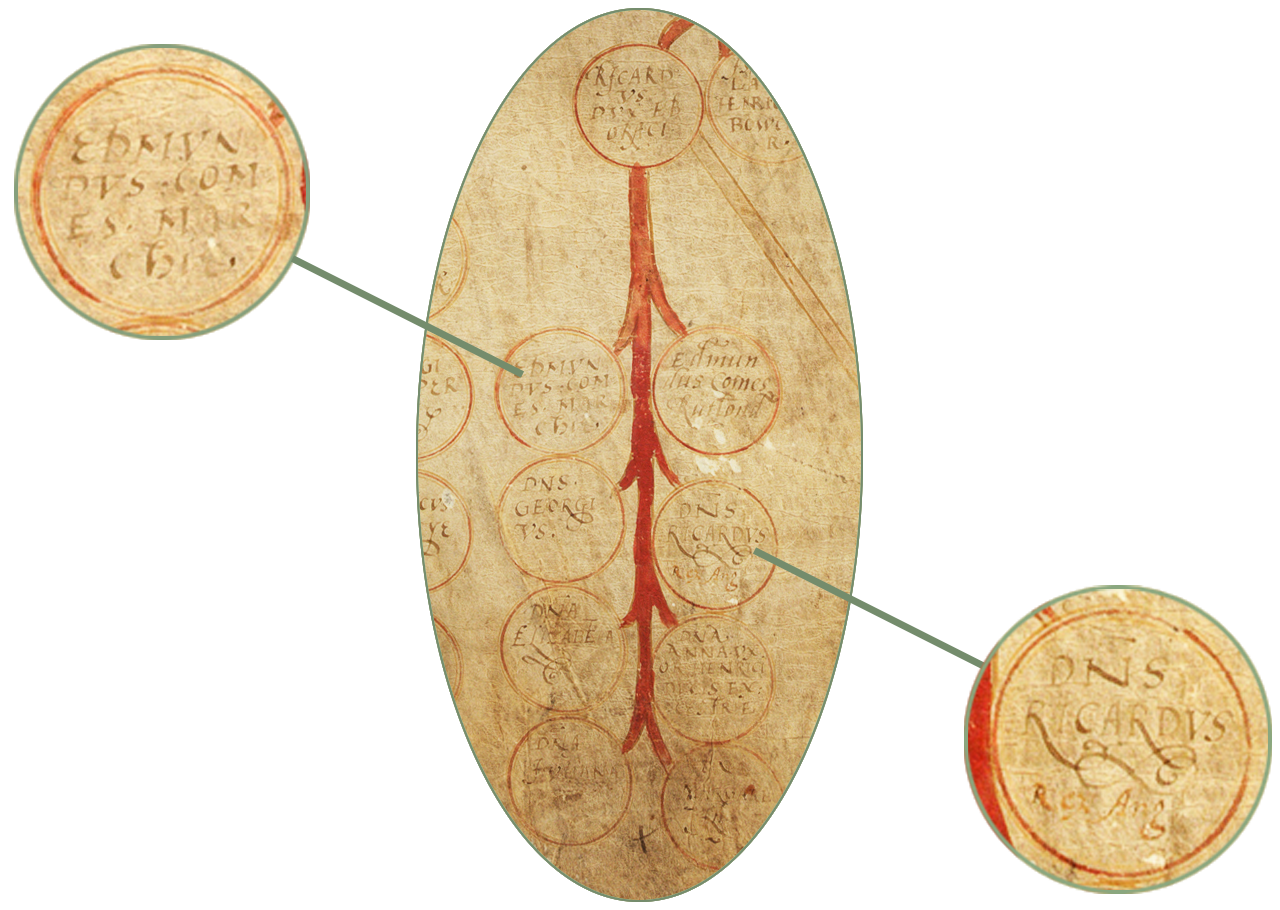 As this roll makes abundantly clear, Edward III had numerous noble offspring, the ancestors of the main combatants in the War of the Roses, TM 840, membrane 12 (detail)