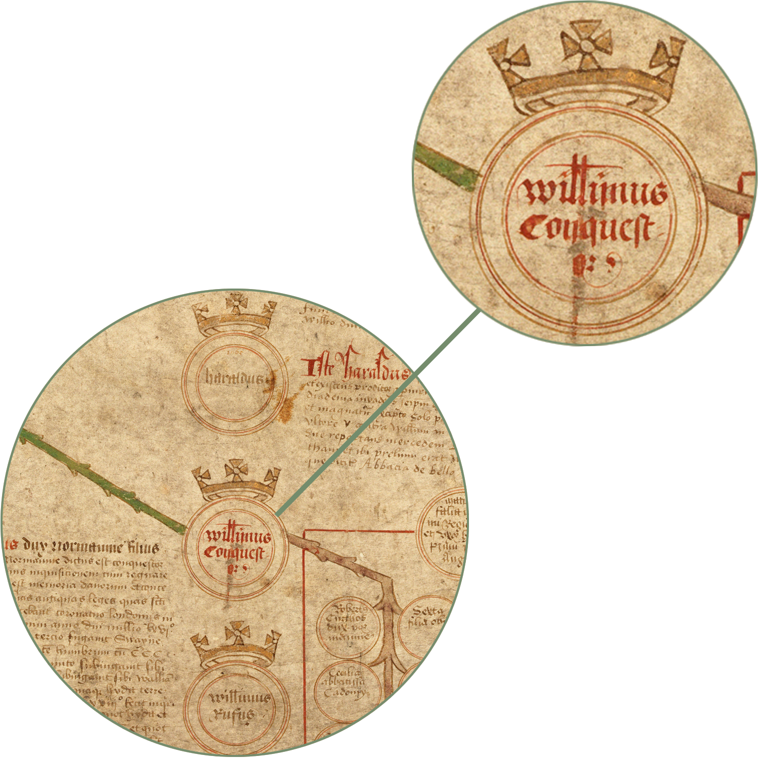 Swooping in from the green Norman line on the left and occupying a central, crowned roundel, William the Conqueror was a real red-letter monarch, TM 840, membrane 8 (detail)