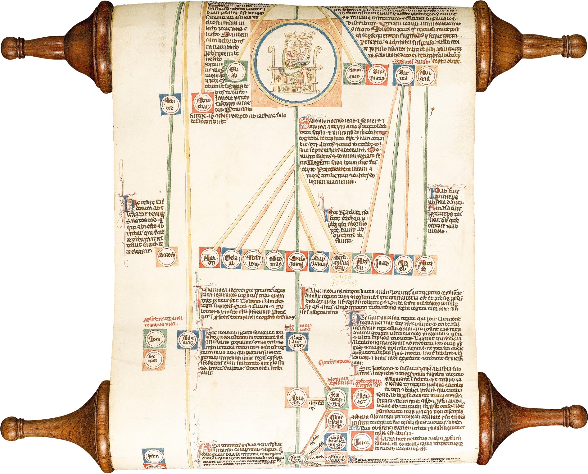 Our royal genealogical roll would have drawn on examples like our beautifully illustrated copy of a genealogy of Christ by Peter of Poitiers, Compendium historiae in genealogia Christi, England, Oxford?, c. 1230-1250