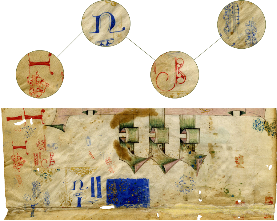This parchment test sheet reveals a few of those secrets, filled with pen and brush trials showing the hand(s) of an artist or workshop experimenting with colors and letterforms. It is a rare glimpse over the shoulder of an early Renaissance artist at work.
