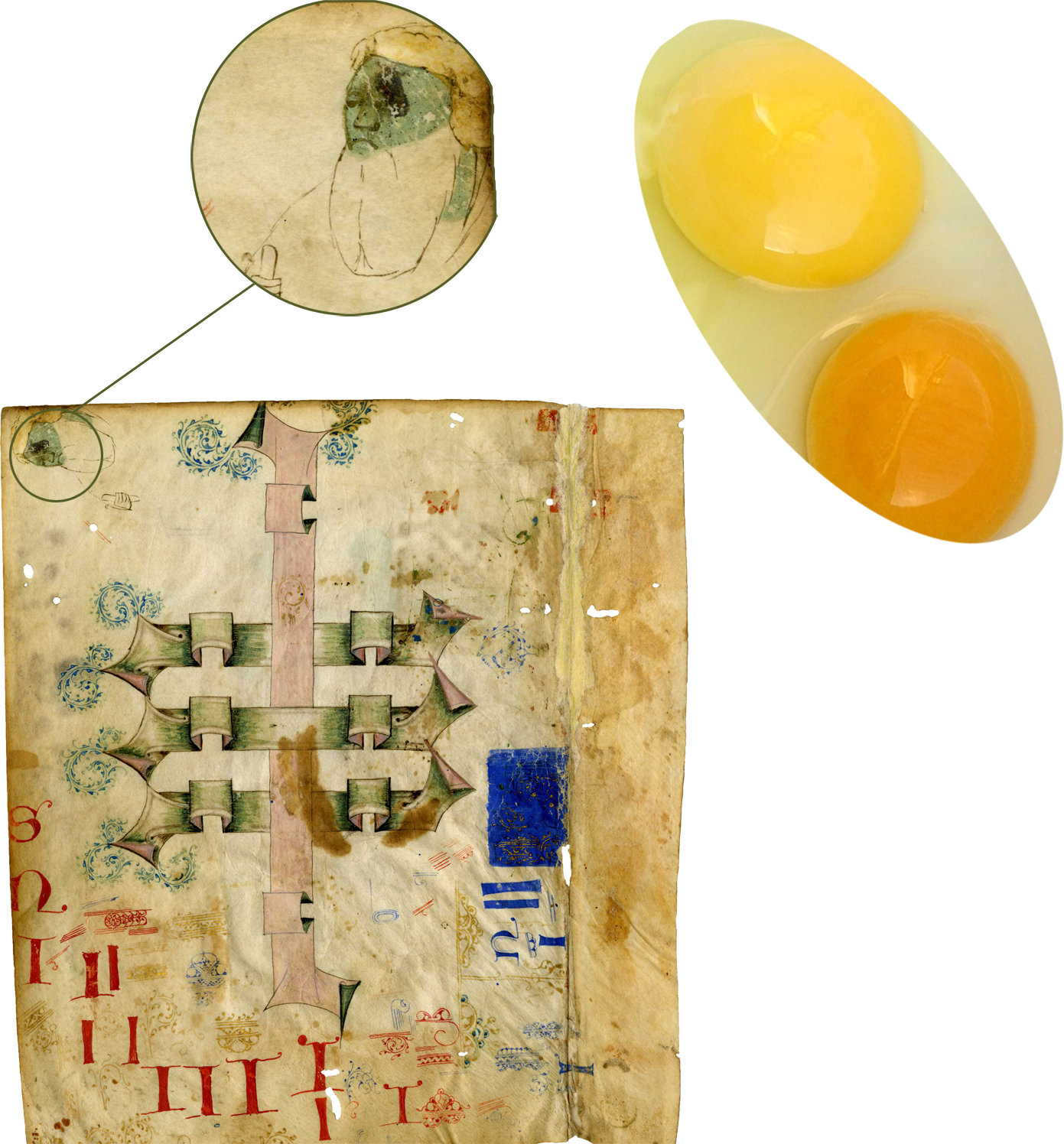 The secrets revealed in Cennini’s instructions are so valuable that artists, conservators, and even art forgers (reportedly) have continued to use them. First Cennini says “take a little terre-verte [green earth] and a little white lead, well tempered, and lay two coats all over the face, over the hands, over the feet, and over the nudes.” This first step can be seen in the face of a bearded man on the front of our leaf with a thin coat of green earth. Cennini specifies that the faces of young people “with cool flesh color” should be tempered with pale yellow yolks from a “town hen’s egg,” as opposed to the eggs from farm hens which are more orange, like the free-range eggs from the farmers’ market.