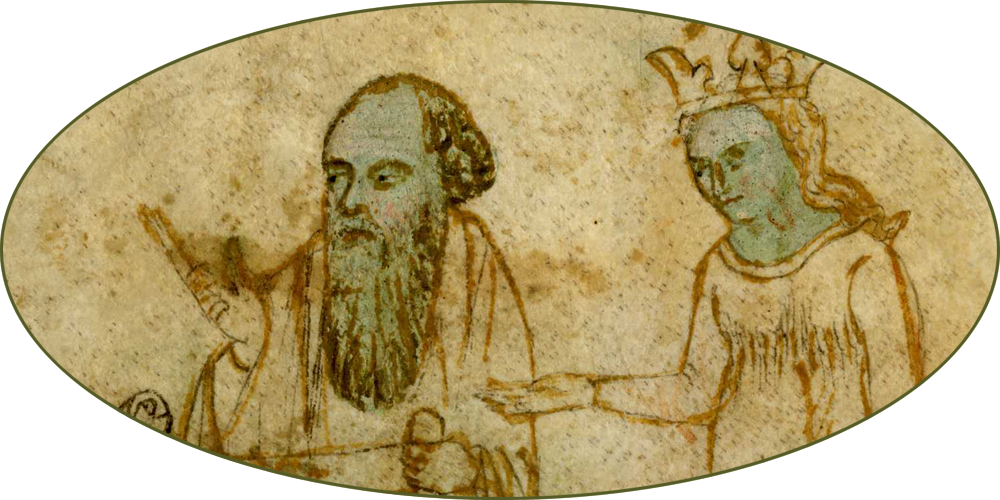 After building layers of green earth with lead white, Cennini next says to create flesh colors with pinks and reds, specifying cinnabar for wall paintings and vermillion for panel paintings (vermillion also being used in manuscript illumination). After using multiple layers to “pick out the forms of the face,” noses and eyes are later outlined in brown or black. A bearded man (perhaps Moses) and a crowned woman on the reverse of our leaf show later stages of this kind of verdaccio, with vermillion mixed into lead white and painted over the foreheads and cheeks.
