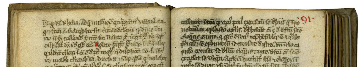 The second scribe of this fourteenth-century sermon manuscript added folio numbers in red; TM 779, ff. 90v-91, Italy or Southern France (?), c. 1300-50 (?)