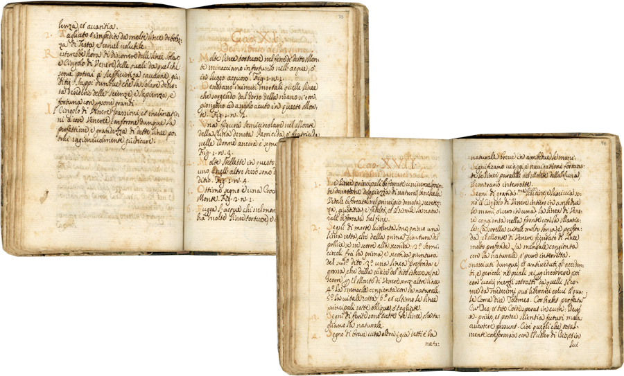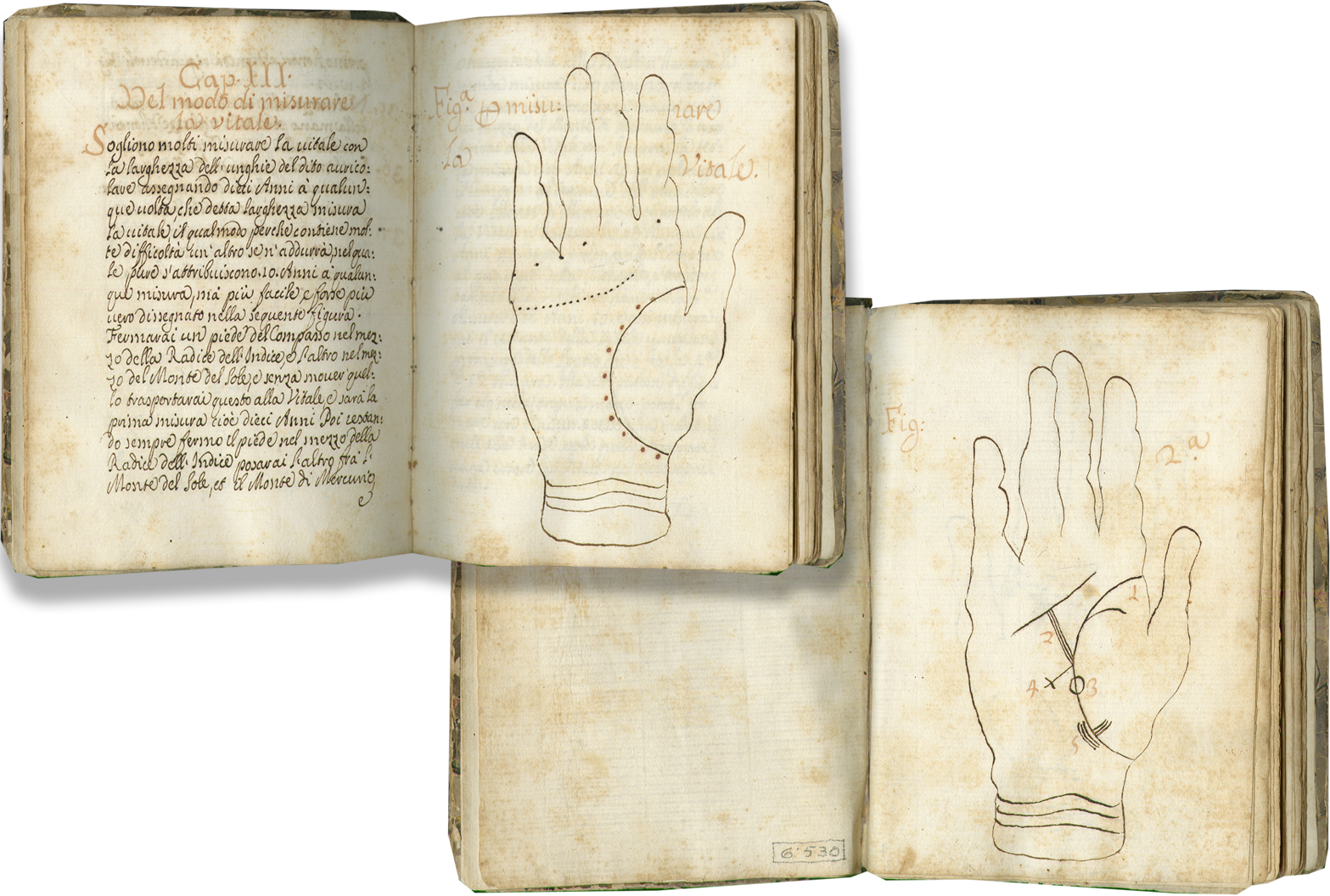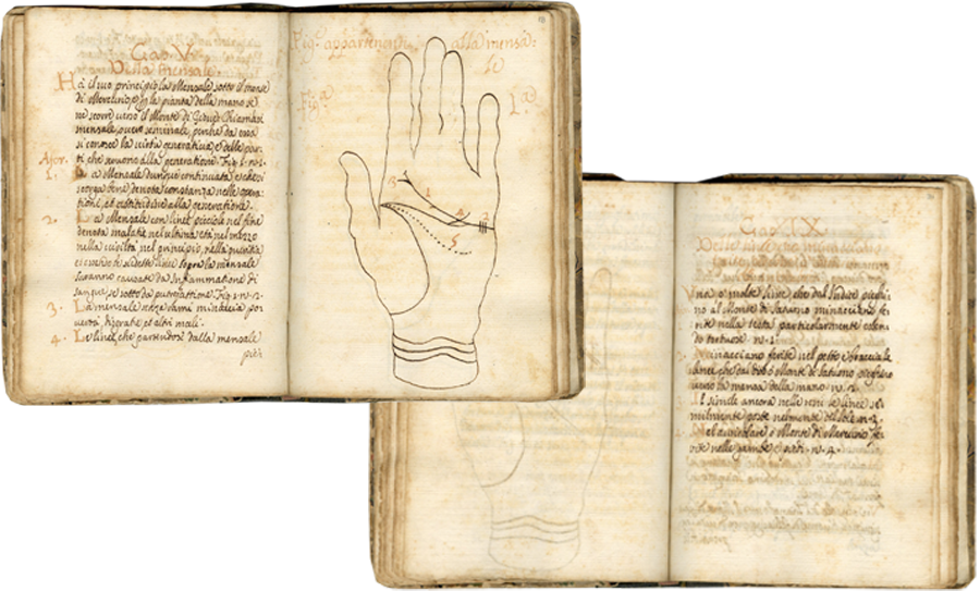 Contrary to popular belief, chiromancy was sometimes used––not by witches–– but by late medieval witch-hunters, who interpreted pigmentation spots as signs of a pact with the Devil. Then, after a period of disrepute (coinciding with the persecution of the Roma in the 14th and 15th centuries), palmistry flourished again in the Renaissance. Renaissance scholars were often well versed in palmistry, and markings for different kinds of patterns were devised and illustrated in printed manuals. In the 17th century, when our manuscript was copied, attempts were made to develop empirical and rational foundations for its basic principles.