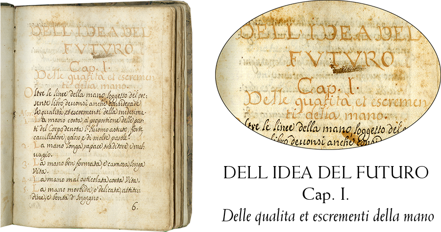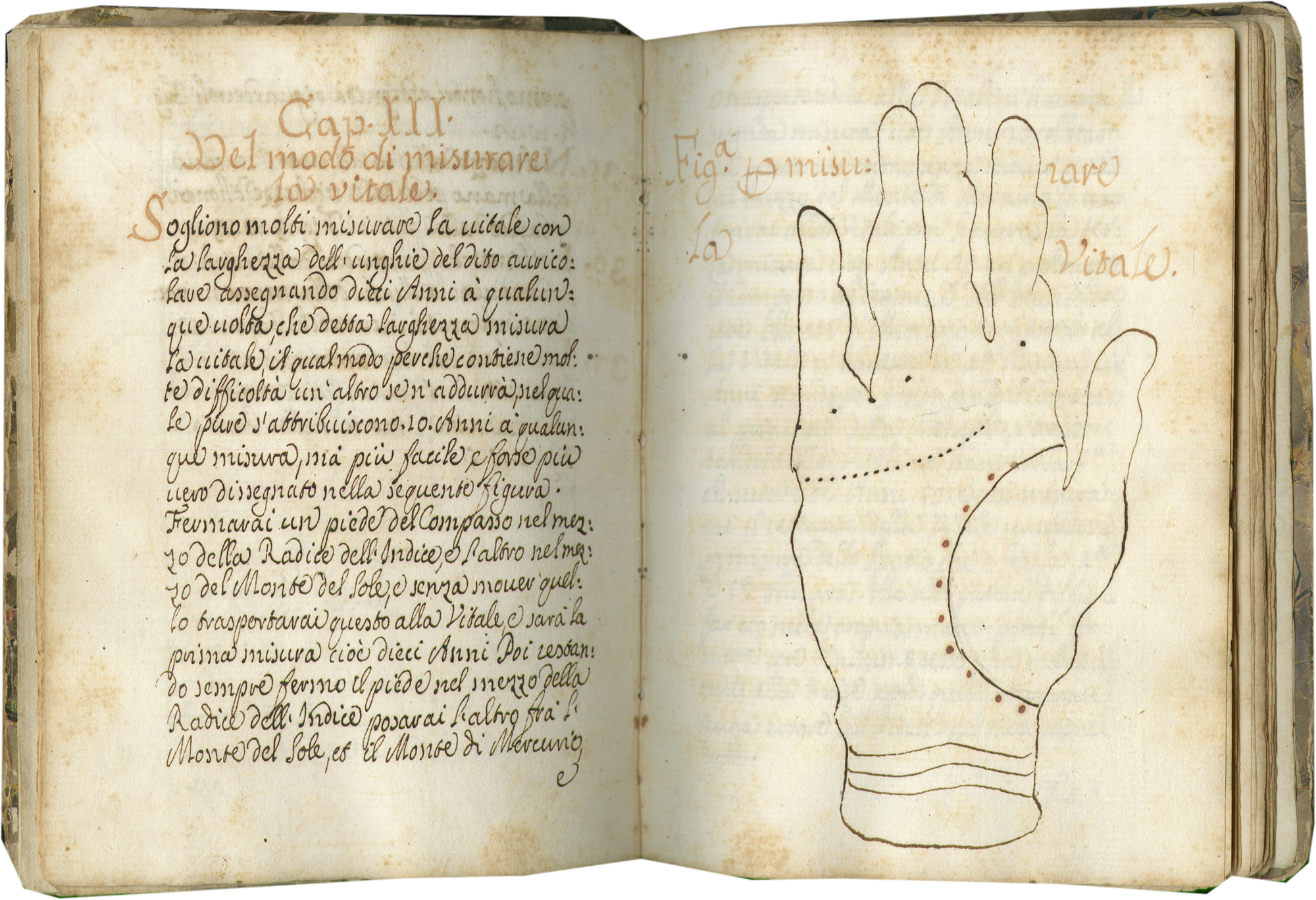 Today we will explore the use of the palm as a tool for prediction, a salve for uncertainty, through one of our text manuscripts, TM 1111. This manuscript is known as the Dell’idea del futuro–– meaning “On the idea of the future.” It is an unpublished treatise on chiromancy copied in Central Italy, likely Florence, in the 1600s.