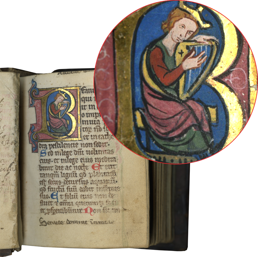 TM 1020, Psalter, f. 1. Caption: King David playing his harp at the beginning of a tiny Psalter used by nuns.