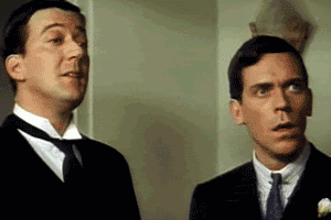 Eastman/Granada TV series Jeeves and Wooster, screened between 1990 and 1993; Stephen Fry as Jeeves (left) and Hugh Laurie as Bertie Wooster (right).
