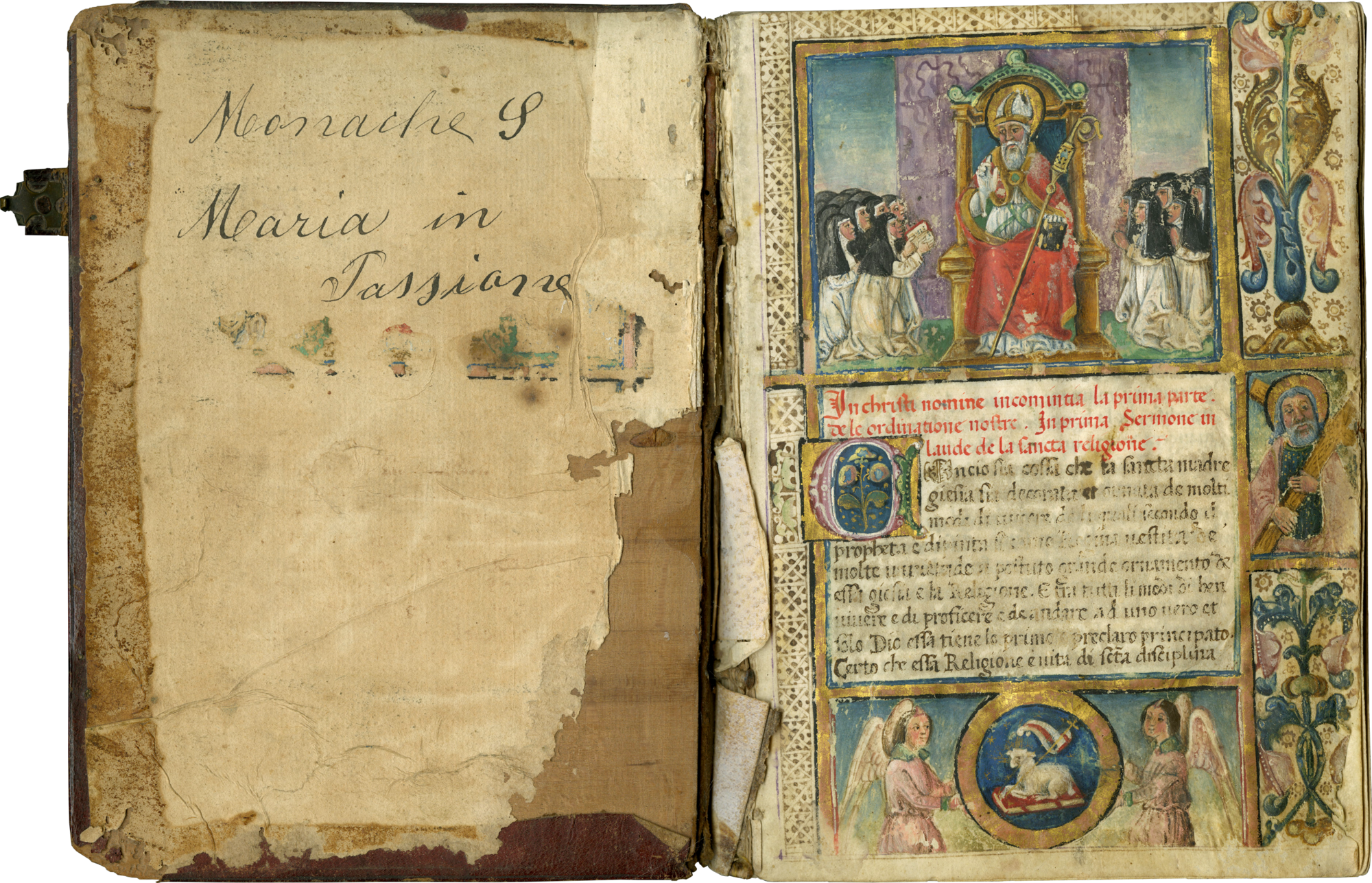 One final example takes us to Genoa, and a remarkable volume copied in 1511 at the monastery of Santa Andrea della Porta by Father Gregorio da Piacenza, confessor of the nuns (he thoughtfully included a colophon at the end of the volume telling us all that). Originally a monastery (one of the oldest in Genoa) for Benedictine nuns, in 1510 Augustinian Canonesses Regular of the Lateran congregation replaced the earlier Benedictine congregation. This manuscript, with its wonderful illuminated frontispiece that includes a picture of the nuns, marked this important moment in the history of the convent.