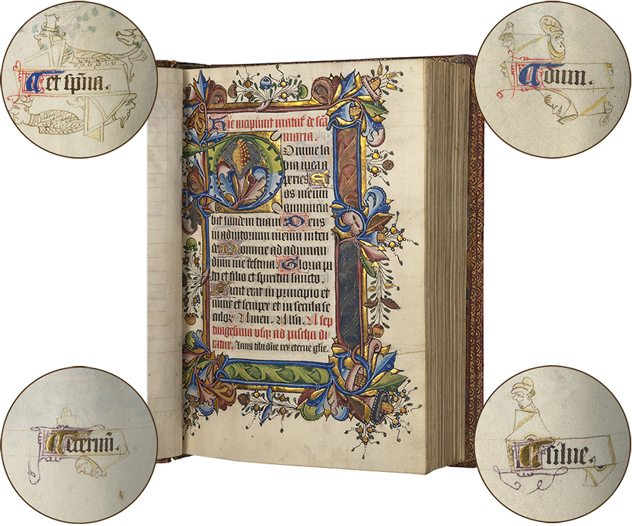 Other scribes imagined possibilities for animating catchwords, that is, the words written at the end of each gathering at the bottom of the page, which rehearse the opening words at the beginning of the next page that open the succeeding gathering. In the simplest examples, flourishes of penwork frame the word or words. Sometimes the bodies of animals – dogs and marmots – became receptables for the words. More intricate examples, such as occur in the Spicer Hours made for a spice merchant in London the mid-fifteenth century, include fanciful drawings of animals, grotesques, heads, and banderoles.