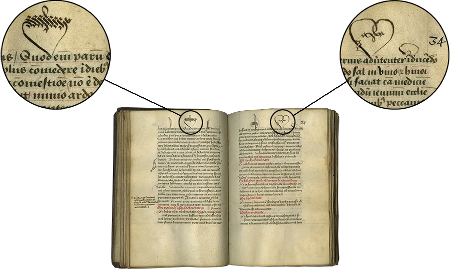 Whereas readers typically used the vertical blank space of the margin, scribes often turned to good use the top and bottom horizontal margins. Some especially adept scribes employed “cadels,” which are calligraphic ascenders that stretch the vertical bars of the letters into the empty space above the written line, often forming decorative patterns. The word “cadel” derives from the Latin capitalis which also produced the French word cadeau meaning gift and chattel meaning tangible property. I like the idea of the “cadel” as a scribe’s gift to the page, as part of his own personal property. Some of my favorite “cadels” enliven the pages of a medieval confessor’s manual, ironically strewing the upper margins with calligraphic hearts.