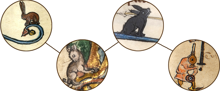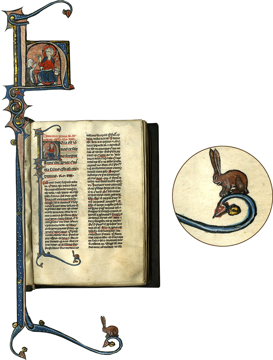 Sometimes the same artists that illuminated deluxe manuscripts such as Books of Hours, Breviaries, Psalters, and Bibles, did double duty and added painted marginalia to accompany text manuscripts. This is the case with a thirteenth-century Parisian copy of Sermons by Nicolas of Gorran, a Dominican preacher and royal advisor. Produced in a high-end Parisian workshop, the manuscript opens with a historiated initial of Christ enthroned who blesses the preacher-author kneeling before him. Of interest to us here is the baguette border along the left margin that terminates at the bottom of the page with a rabbit posed precariously on the tip of the branch. Rabbits are ubiquitous in the margins of medieval manuscripts. They hunt, they ride horses, they wield swords, they attend church, they play music