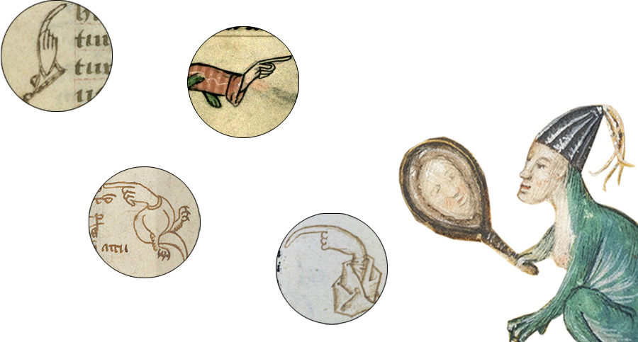 Let us remember that the margins of medieval manuscripts were ample – Erik Kwakkel has emphasized that the average space around a writing block was about 50%. As he puts it, the manuscript page was “half empty, half full.” This left a lot of blank space for readers to interact with their books. One common annotation by readers is the manicula, literally “little hand” in Latin. A great variety of pointing hands can be found in manuscripts. They sometimes wear gloves, have fancy cuffs, even show the whole sleeve of a garment, don rings on their fingers. They are almost always distinguished by an index finger (usually) that points to a specific line of text. The equivalent of a modern highlighter, or perhaps a pen-drawn arrow, the flourished pointing hand is a source of endless amusement, but it also reveals what different readers found interesting in their books.