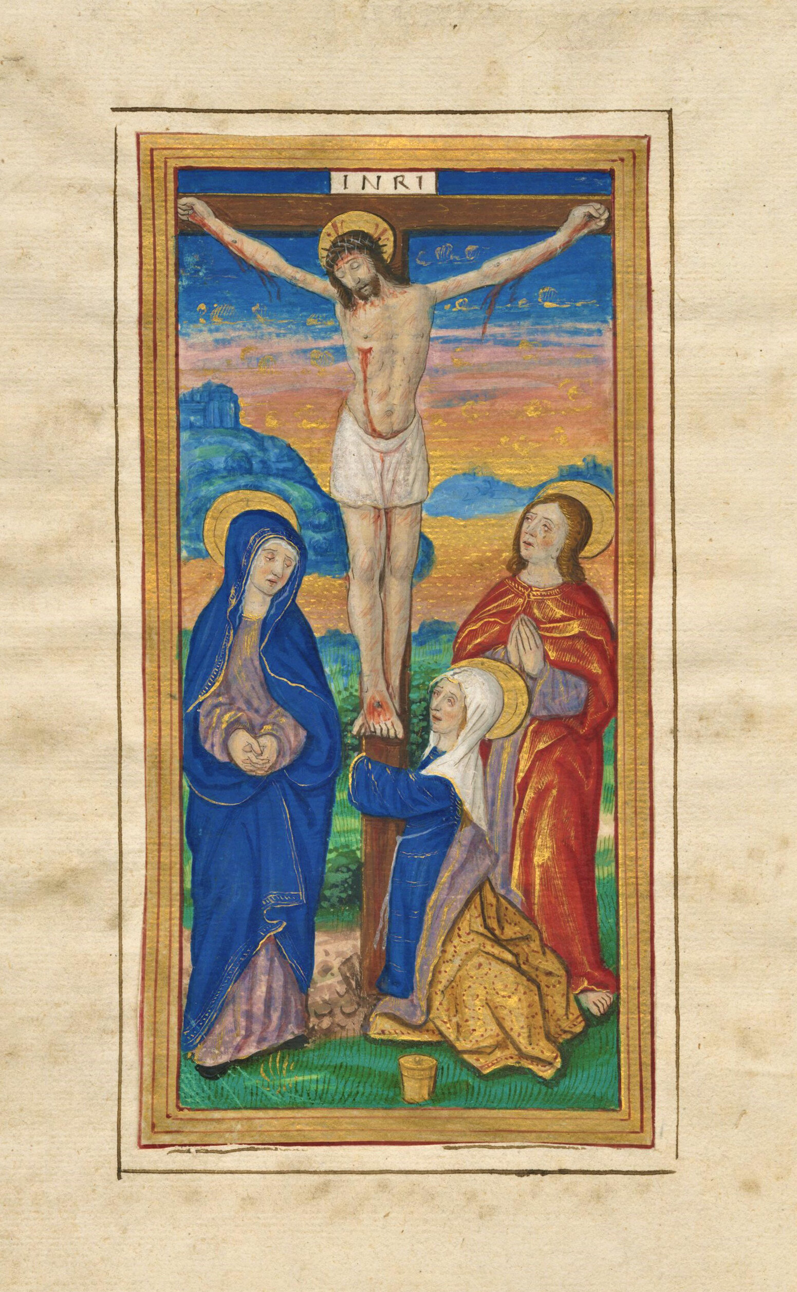 Painting, including illumination modeled on medieval illumination but not identical to any specific medieval style, was an extremely popular activity in the mid- and later nineteenth century across Europe, and it was widely taught as a potentially marketable skill for young ladies of the petite bourgeoisie. An enormous number of instruction books were printed to teach illumination, and gift books were full of engraved plates of facsimiles of medieval illumination. Increasingly such books employed chromolithography, an early color reproduction process, which often produced a rather dull color palette when not carefully printed: this may explain the subdued tones of these miniatures, if they were painted based on mass-market chromolithographed color, rather than modeled on actual jewel-bright medieval illumination. A pious young woman might well have painted these miniatures herself, or ordered them from a professional illuminator, to add to a medieval book of devotion no less devout in 1875 than it was in 1375.