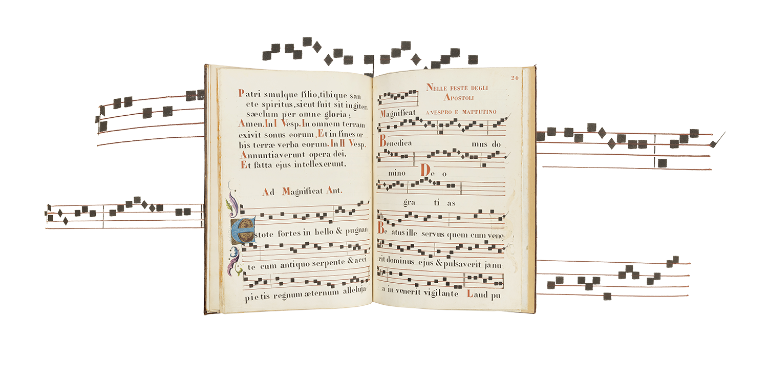 TM 1356 offers a superb illustration of the appreciation of late medieval illumination persisting into the late sixteenth century. This antiphonal dates to just after the Tridentine reforms revised the entire Catholic liturgy in the final quarter of the sixteenth century. At a stroke, most medieval liturgical books became outdated and had to be quickly replaced. While many were replaced with printed copies, music remained difficult to print, and so choirbooks continued to be hand-copied for centuries into the print period. This small antiphonal is an excellent example of such a late manuscript. Moreover, the stationer tasked with producing it excised miniatures from a prayerbook dating over fifty years earlier and pasted them into this antiphonal.