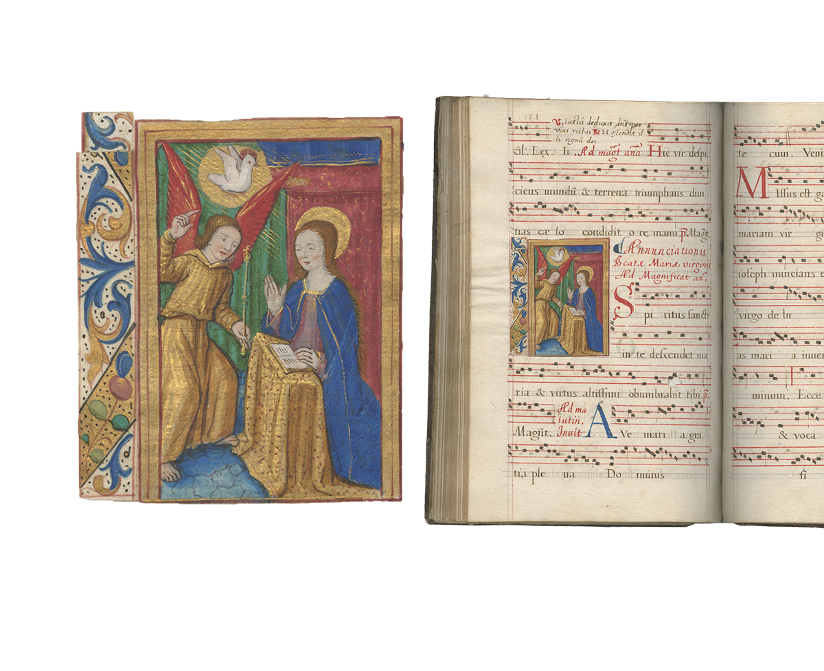 These miniatures are by the Master of Philippe of Guelders or his workshop, an artist who had ties with the House of Lorraine. A member of that noble house might have donated a family prayerbook to be dismembered for use in an antiphonal gifted to a religious institution connected to the family. In this case, medievalism was not simply appreciation for fifty-year-old fine art, but may also offer physical evidence for generations of support of a religious institution by a noble family.