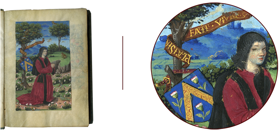 In January, while studying another book of hours painted in Rouen in the 1480s for an unidentified woman, BOH 183, I was captivated by a miniature added to the book. The miniature shows a young man kneeling in prayer, with his coat of arms, d’azur au chevron d’or accompagné de trois marguerites au naturel, and his motto “Plaisir fait vivre” attached to the tree behind him.
