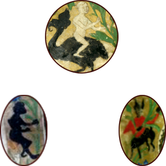 In the inner margin, there is a grotesque, half man and half donkey, with the black ears of a jackass, who admires himself in a black mirror. Below, there is a black monkey. Black in these images signifies bad, white good.