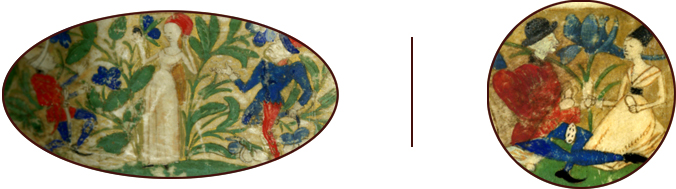 In the miniature, marguerites (daisies) fill the field in small bouquets and decorate the coat of arms, as if they were the personal emblem of the man portrayed. However, one curious detail suggests that it is not an ordinary patron portrait: the man’s eyes are closed. Daisies, marguerites, symbolize love; they appear in springtime, the season of love. Is this a poetic, figural portrayal of love toward a woman called Marguerite? In the miniature there are also monkeys perched in the tree and sitting on the grass, eating golden fruits referring to pleasure, the young man’s desire for his beloved. Some forty years after the image was painted, around 1527-1529, Marguerite of Navarre, the sister of Francis I, would describe love in these terms in her poem Le miroir de l’âme pécheresse: