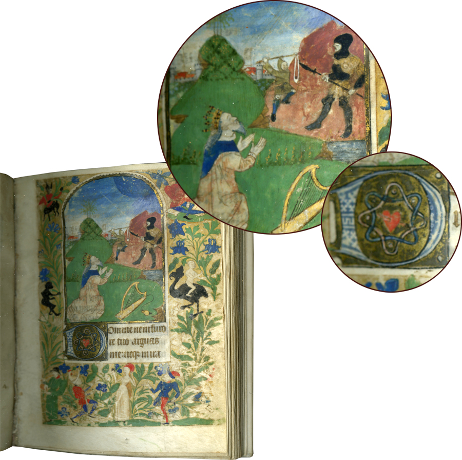The initial on the leaf that opens the Penitential Psalms contains a pierced heart inside two entwined bands forming a love knot.