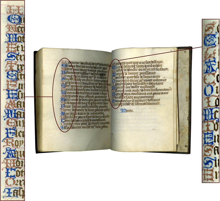 Back in December, I was cataloguing a French book of hours, BOH 179, which at first glance resembled dozens, maybe hundreds of similar books that I had seen before, painted in the 1480s for an unidentified woman (or a couple) in Normandy, this one in Bayeux. However, what caught my attention was a rhymed prayer copied at the end of the book for a later owner. The prayer is built around an acrostic: the initials beginning each verse spell out “Honneste femme Françoise La Cointesse (Comtesse)”, i.e. Honest woman/wife Françoise The Countess. Hitherto unknown, the prayer was very likely composed by Françoise de Foix, the Countess of Châteaubriant, and the first mistress of Francis I, King of France.