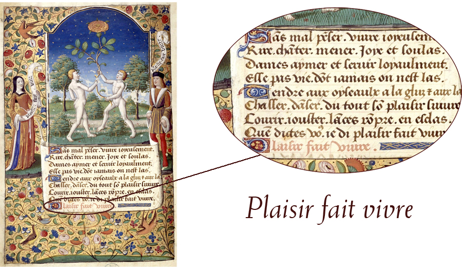 Two poems entitled “Plaisir fait vivre”, composed c. 1480-1482 and c. 1491-1494, around the time our leaf was painted, are essential for understanding the miniature. The earlier poem was written by the jurist Jean d’Affray, and reads as follows: