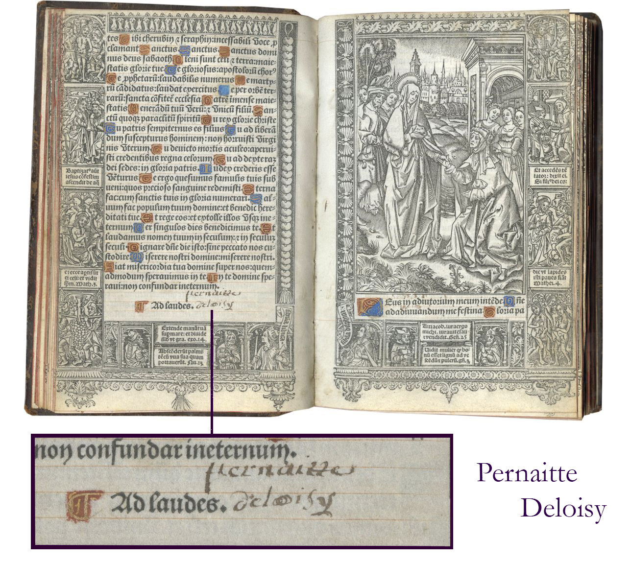 Books of Hours are often thought to represent a sort of rom-com for a late medieval female audience. This is not true. Books of Hours were owned by everyone. This one, however, was indisputably owned and used by a woman. In three separate places in the text Pernette (or Pernaitte) Deloisy (or de Loisy) signed her name.