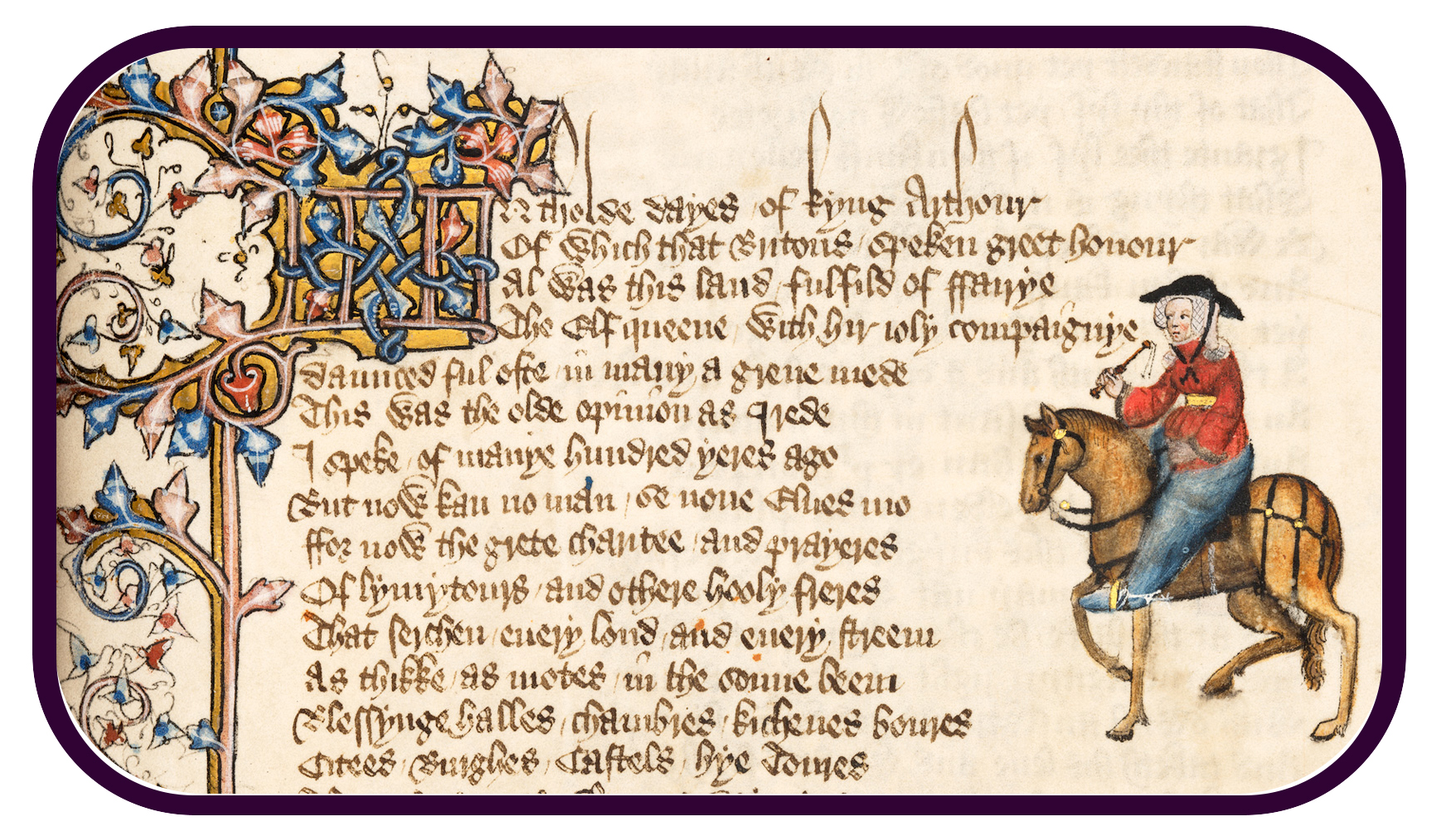 The Huntington Library mss EL 26 C 9, Geoffrey Chaucer, The Ellesmere Manuscript (Canteburry Tales), ff. 72r, an illustration of the Wife of Bath.