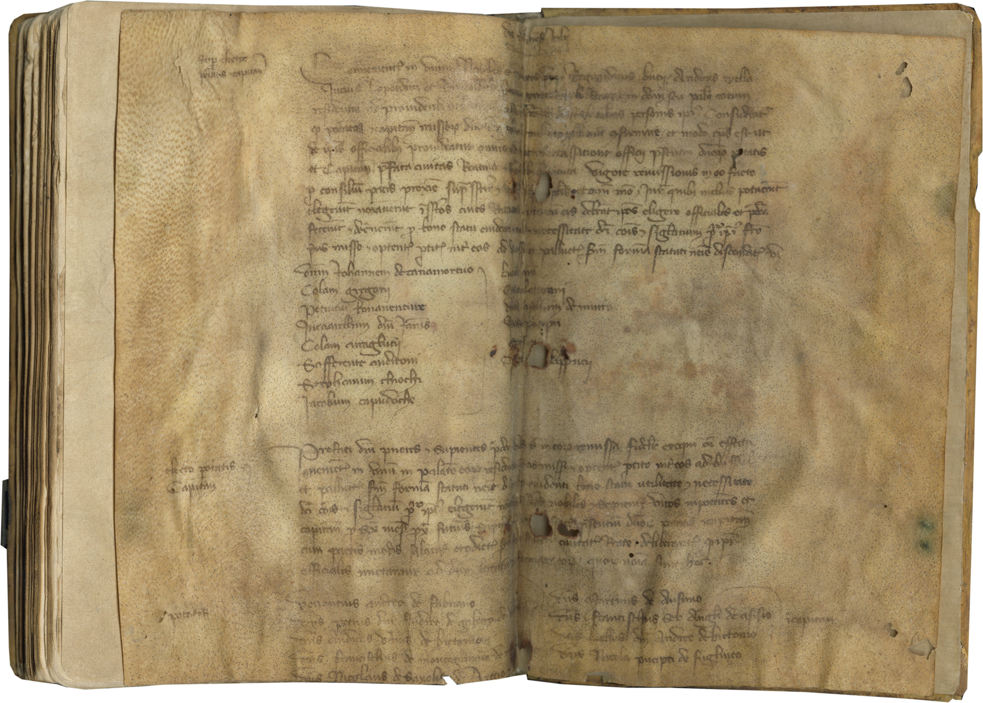 One last note. This manuscript survives in its original binding, with flyleaves from two fourteenth-century documents. These documents can be localized based on their references to the city of Rieti (about seventy kilometers northeast of Rome), to the Benedictine monastery of San Salvatore Maggiore, and to the lord of Rocca Sinibaldi (a town not far from Rieti). Rieti and its archives were the subject of extensive research by the celebrated medievalist, Robert Brentano, in A New World in a Small Place: Church and Religion in the Diocese of Rieti, 1188-1378, Berkeley, 1994.