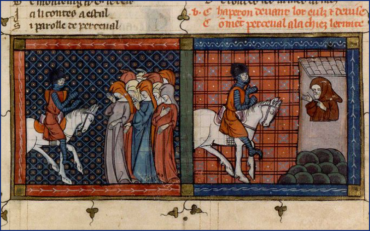 Percival depicted in a fourteenth-century manuscript of Chrétien de Troyes, Perceval ou Le Conte du Graal, Paris, BnF, MS Français 12577, f. 36.