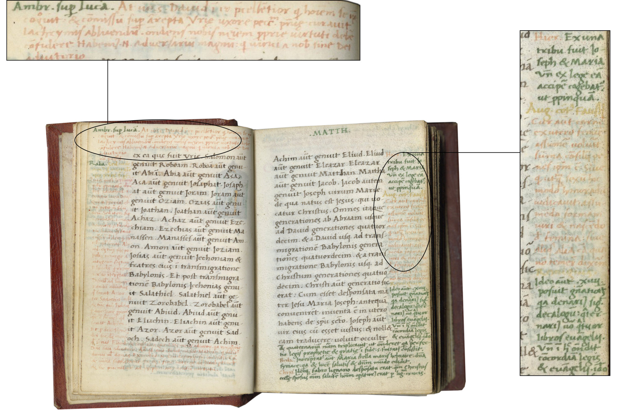 To this point, our discussion has emphasized the sacred functions of the Gospel Book in the Middle Ages. But our tiny humanist manuscript points to another type of Gospel manuscript, namely manuscripts copied for study, like manuscripts of the Gospels accompanied by the Glossa ordinaria, or Ordinary Gloss, which presented the sacred text accompanied by commentaries together on the same page.