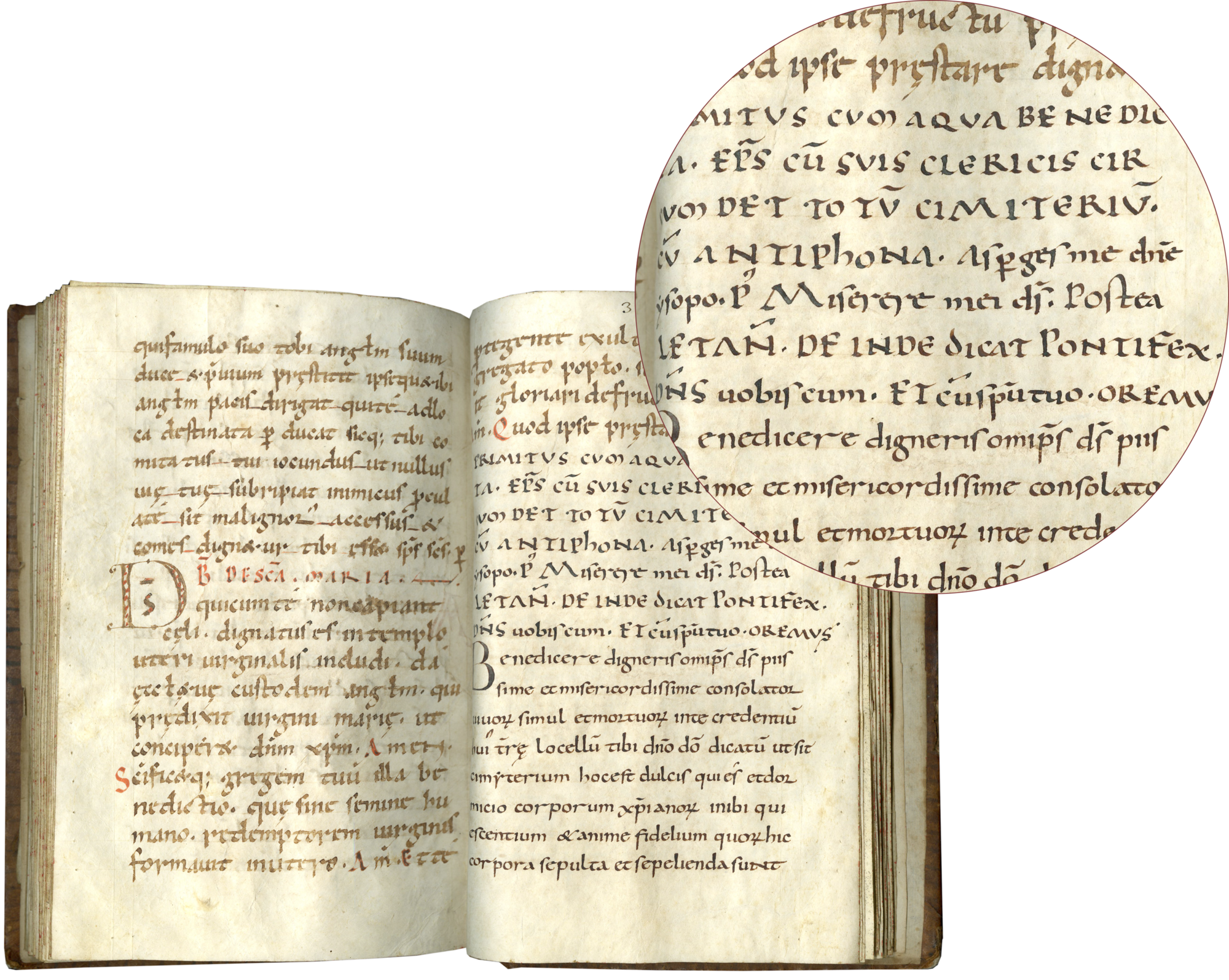 Another mystery is the ritual added in empty space on folio 32, written in slightly darker ink, giving the text for the blessing of a cemetery – an intriguing early witness to changing attitudes about places for the dead. In the late eleventh century cemeteries were increasingly seen as be inviolable spaces, offering protection to both the living and the dead. Anyone found guilty of a crime on cemetery ground would face heavy fines or excommunication. The new importance of sacred cemeteries was popularized by Pope Urban II, who consecrated (or re-consecrated) cemeteries as he traveled through France in 1095. The practice, as described here, involved the bishop and his priests singing songs while walking in a circle around a cemetery and sprinkling holy water.