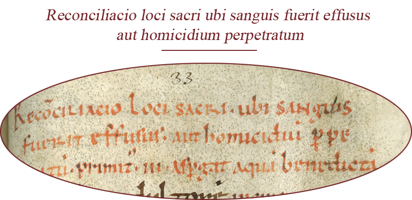 But how? There’s a liturgy for that! One recorded in a special book for the use of priests and bishops: the Pontifical. TM 834, a “Primitive” Pontifical from the late 11th century (c. 1040-1075) copied in Southern or Central France, provides the aptly-named ritual for the “reconciliation of a sacred space where blood was spilled or murder perpetrated” (Reconciliacio loci sacri ubi sanguis fuerit effusus aut homicidium perpetratum).