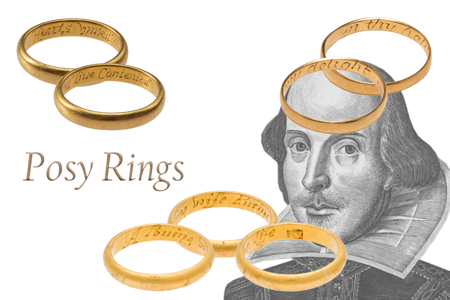 Posy rings, of which we have a very wide selection, are the category of word-rings most closely related to books or literature. Taking their name from the word “poésie,” they bear rhymed inscriptions on the interiors of their bands such as: “Hearts united live contented,” “A loving wife during life,” or “In thy sight is my delight.” Shakespeare mentions them in his plays. But that’s a subject for another blog.