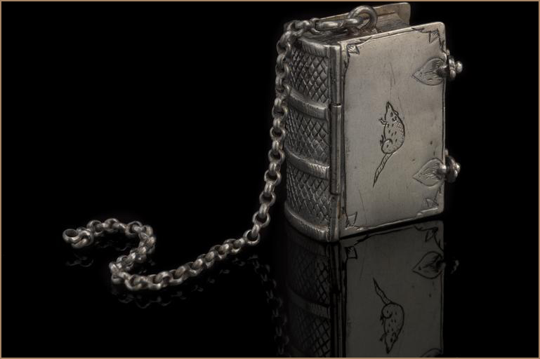 Silver pomander, in the form of a book, containing 6 compartments, with a rat engraved on the side, and chain for suspension, c. 1601-1700