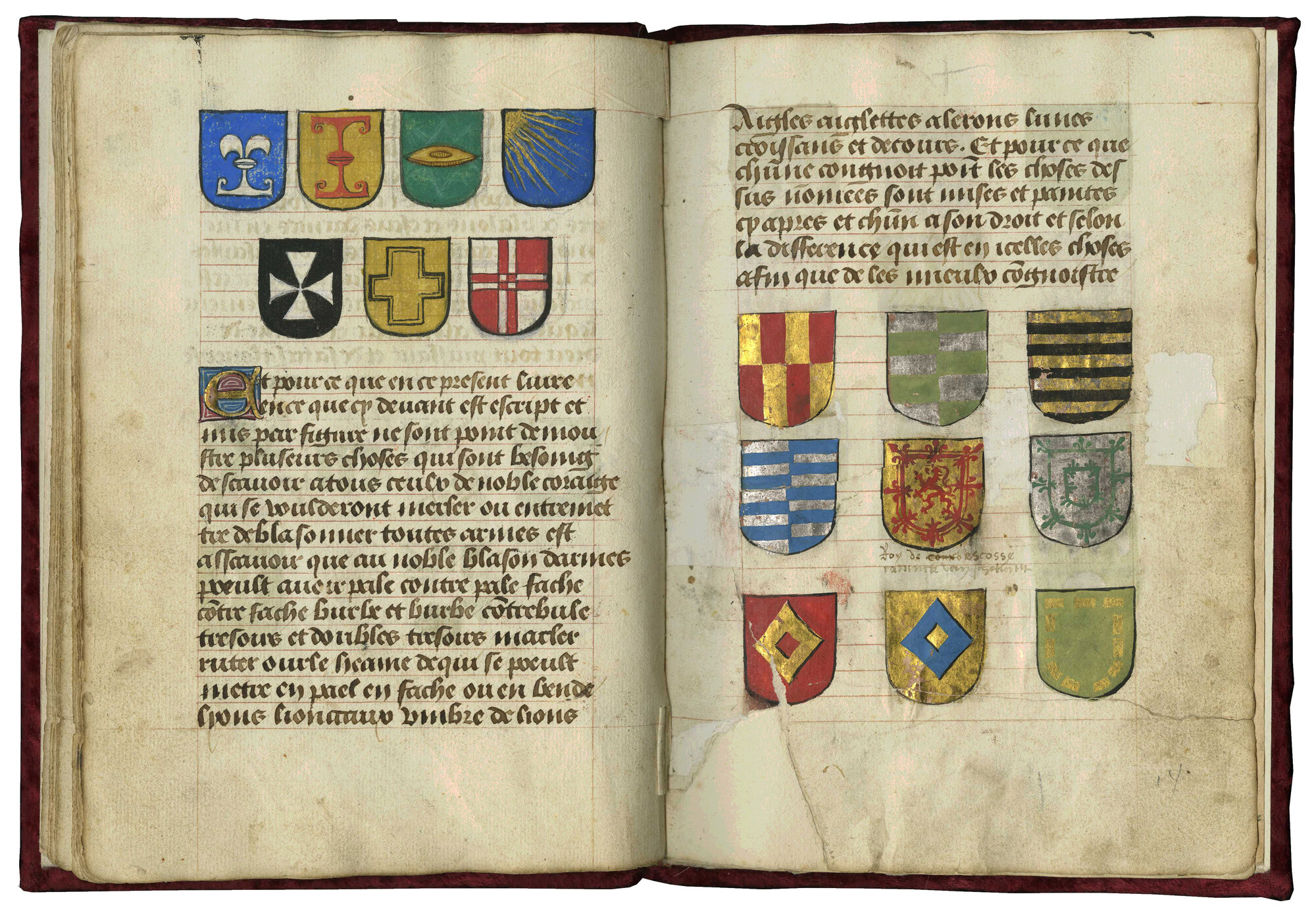 The shields painted on the left of this opening illustrate the ordinaries, or basic geometric figures, used in heraldry, Clément Prinsault’s Traité du blason, TM 818, ff. 7v-8, Northeastern France or the Low Countries (Flanders or Hainault), c. 1480-1500