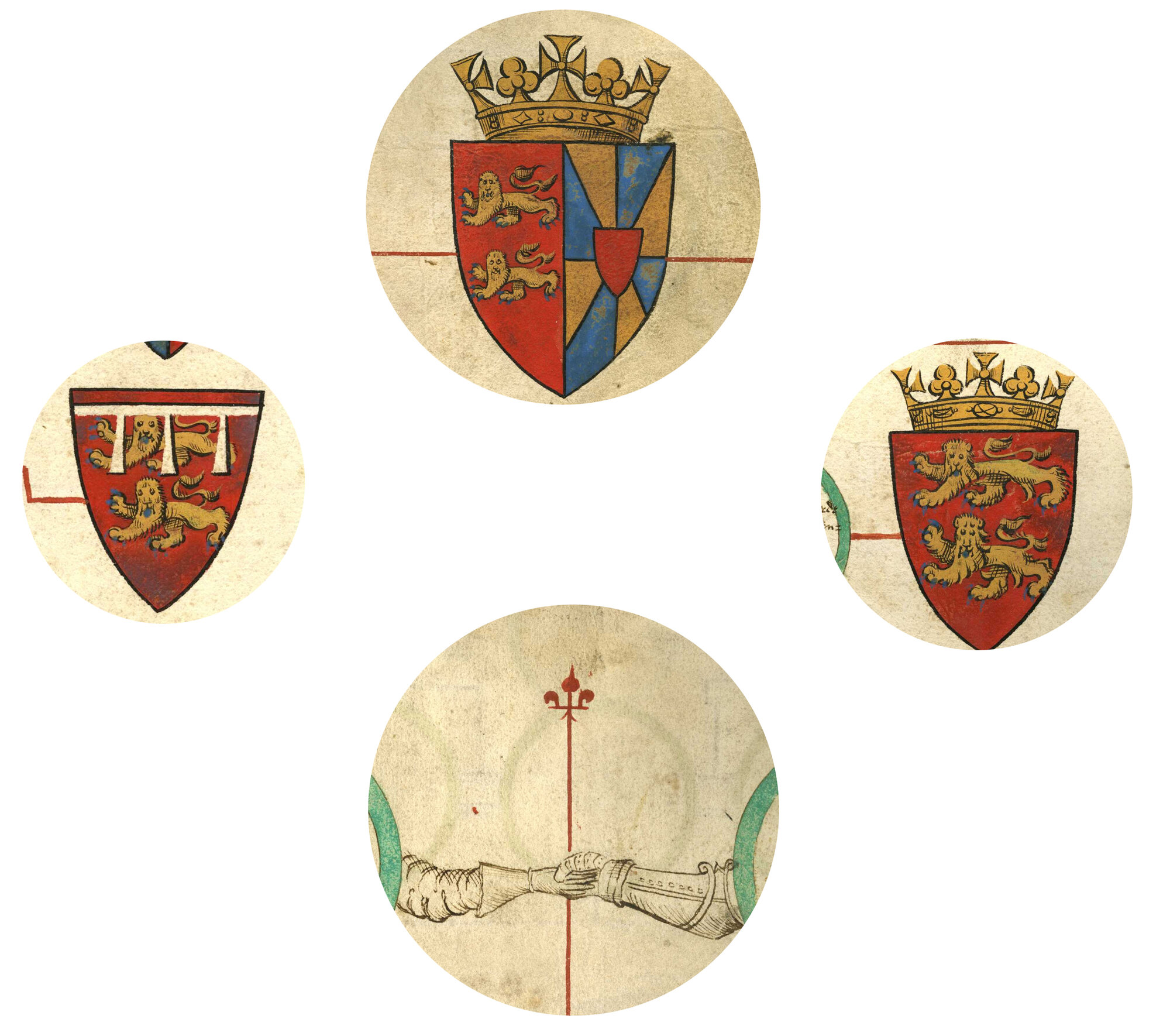 This shield illustrates the tincture gules (red), TM 818, f. 4v (detail)
