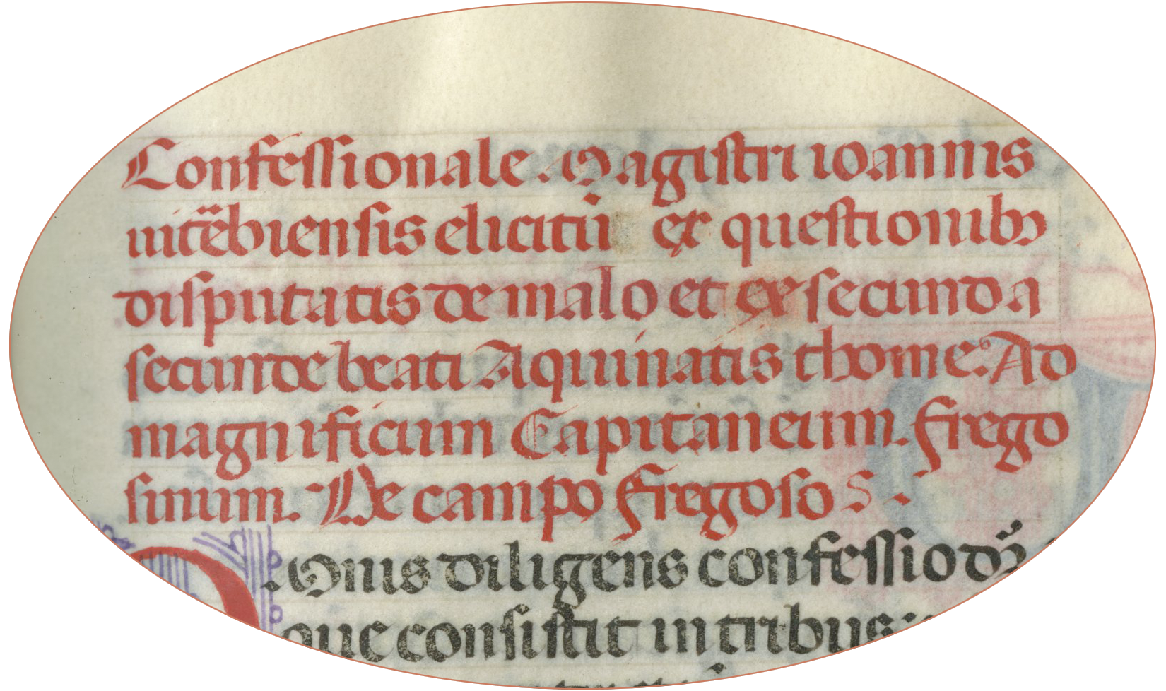 This Latin inscription identifies the text that follows as the “Confessionale of Master Johannes Viterbiensis ... to the magnificent Captain Fregoso, de Campofregoso,” TM 874, f. 209 (detail)