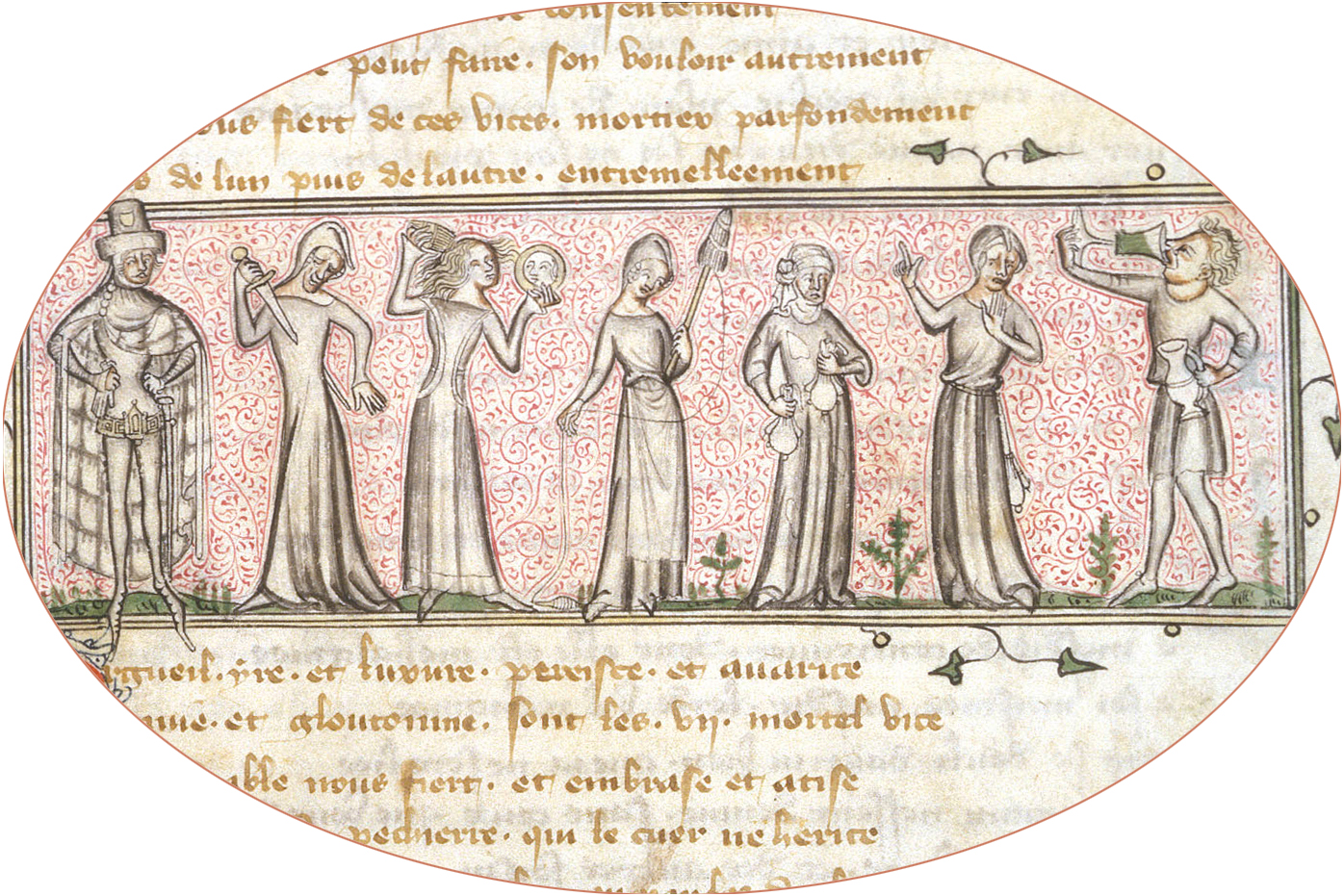 The Seven Deadly Sins – pride, wrath, lust, sloth, greed, envy, and gluttony – are embodied in these figures, illustrating a copy of the Testament of Jean de Meun, London, British Library, Yates Thompson MS 21, f. 65 (detail)