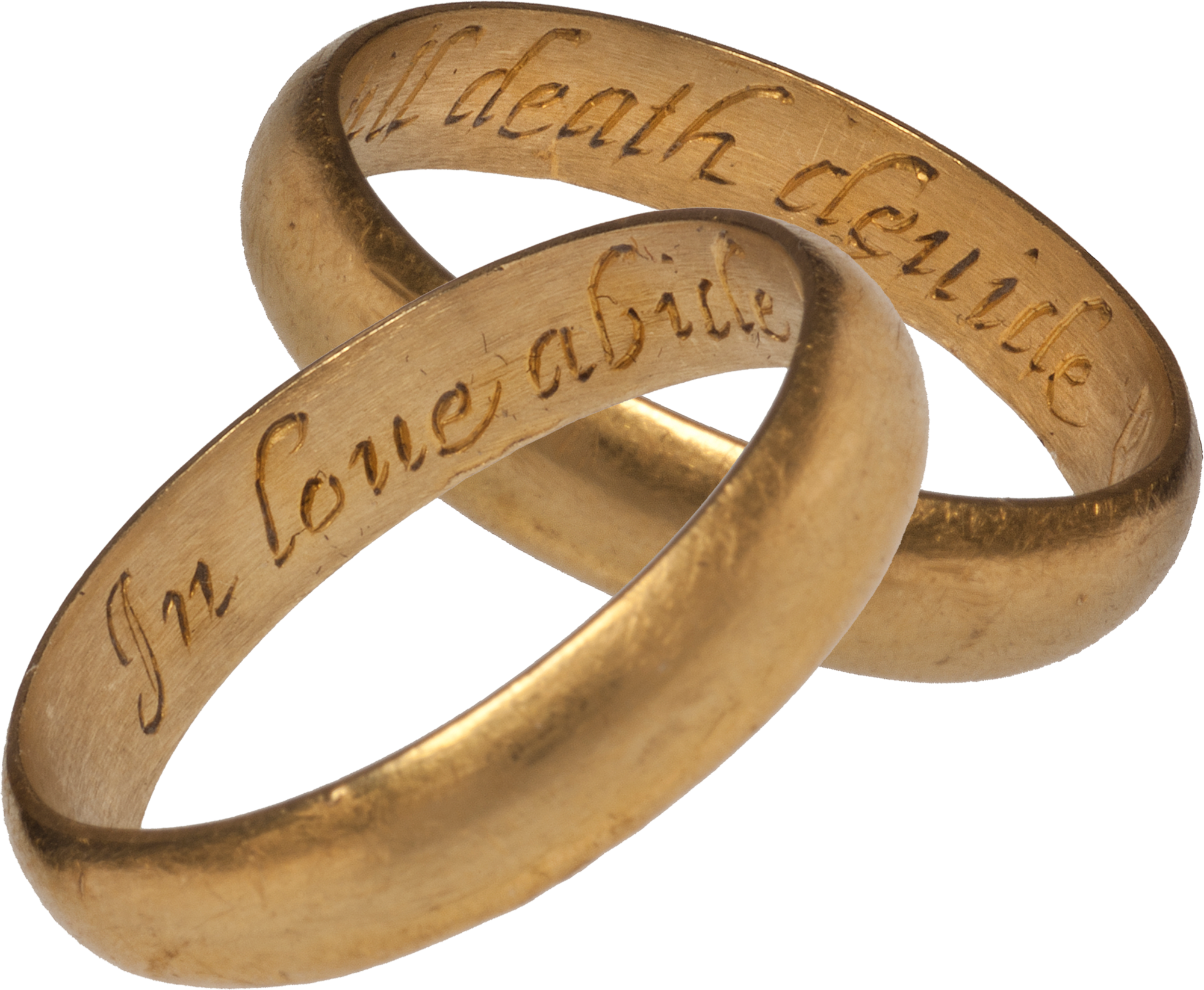 The short verse, or posy, “In love abide till death deuide” has been engraved on the inside of this Elizabethan gold ring, pressed against the wearer’s skin and concealed from the world, England, 17th century