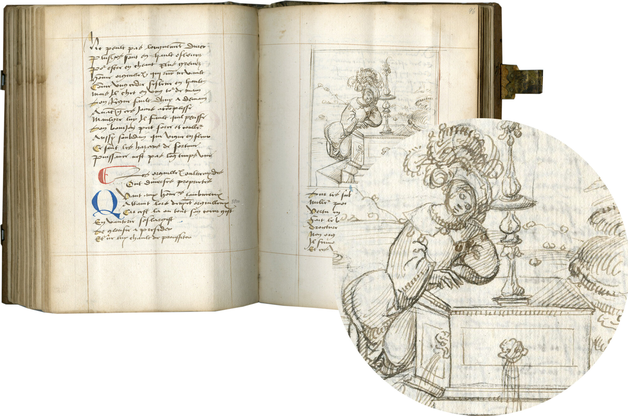 Narcissus gazes at his reflection in this drawing, modeled on a woodcut by Antoine Vérard, in this copy of Guillaume Alexis, Le Passe-temps de tout homme et toute femme and L’ABC des doubles, France, Normandy, Rouen?, c. 1525-1530, ff. 95v-96 (detail)