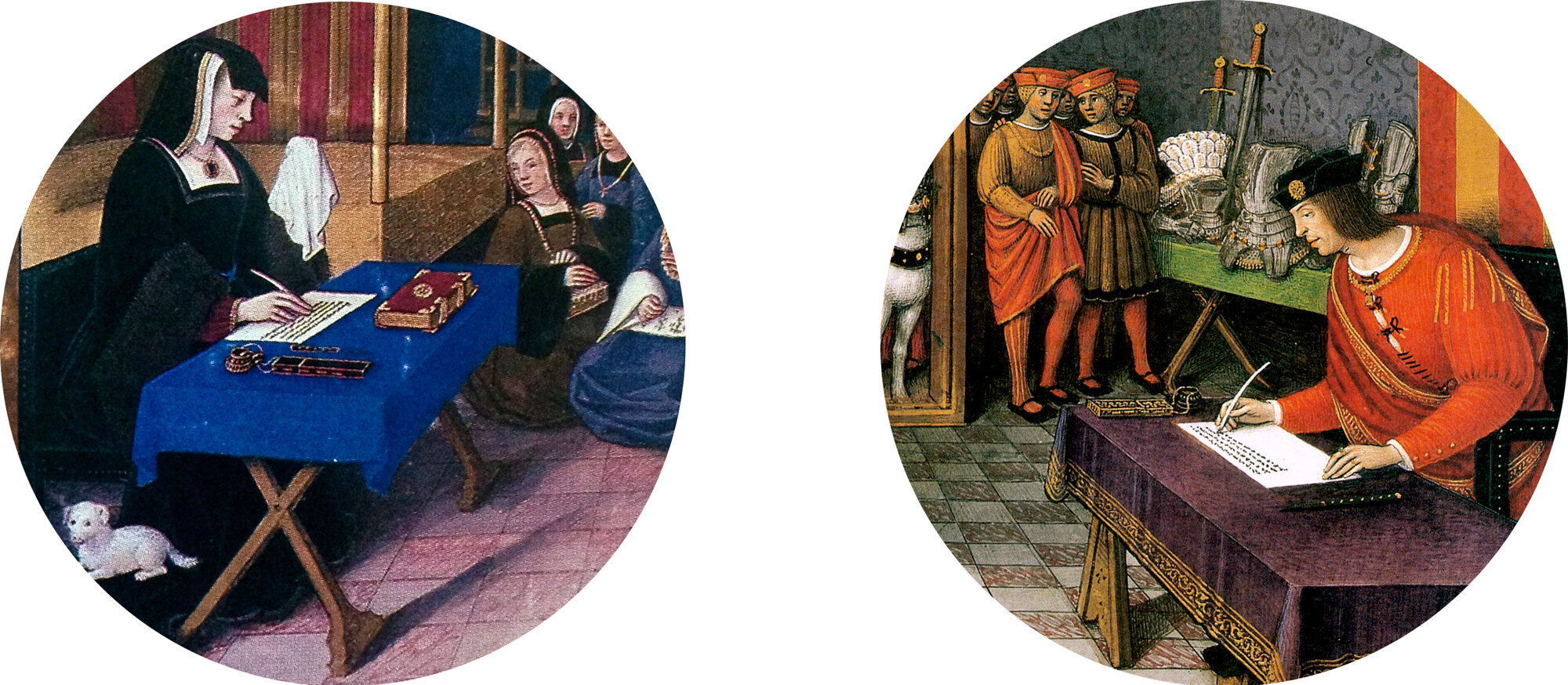 Anne of Brittany writes to her husband, Louis XII, as she mourns his absence, and he writes back to her in these two miniatures, painted by Jean Bourdichon, from a presentation copy of the Epîtres de poètes royaux, St. Petersburg, National Library of Russia, MS Fr. F. v. XIV, 8, c. 1510, ff. 1v (detail) and 51v (detail)