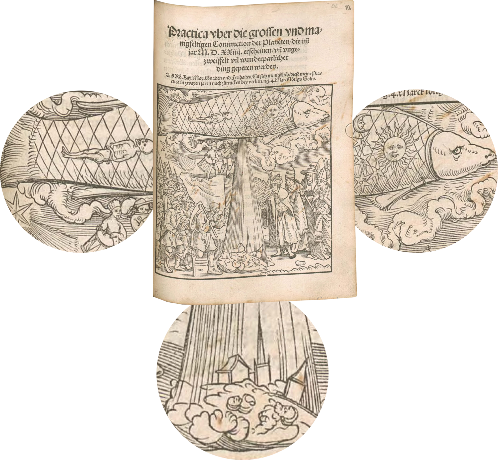 Pisces, marked with a figure of death, looms over a scene of flooding and strife in this title page for a pamphlet advertising the apocalyptic events predicted for 1524, Leonard Reynmann’s Practica vber die grossen vnd manigfaltigen Coniunction der Planeten, printed in Nuremberg by Hieronymus Höltzel in 1523