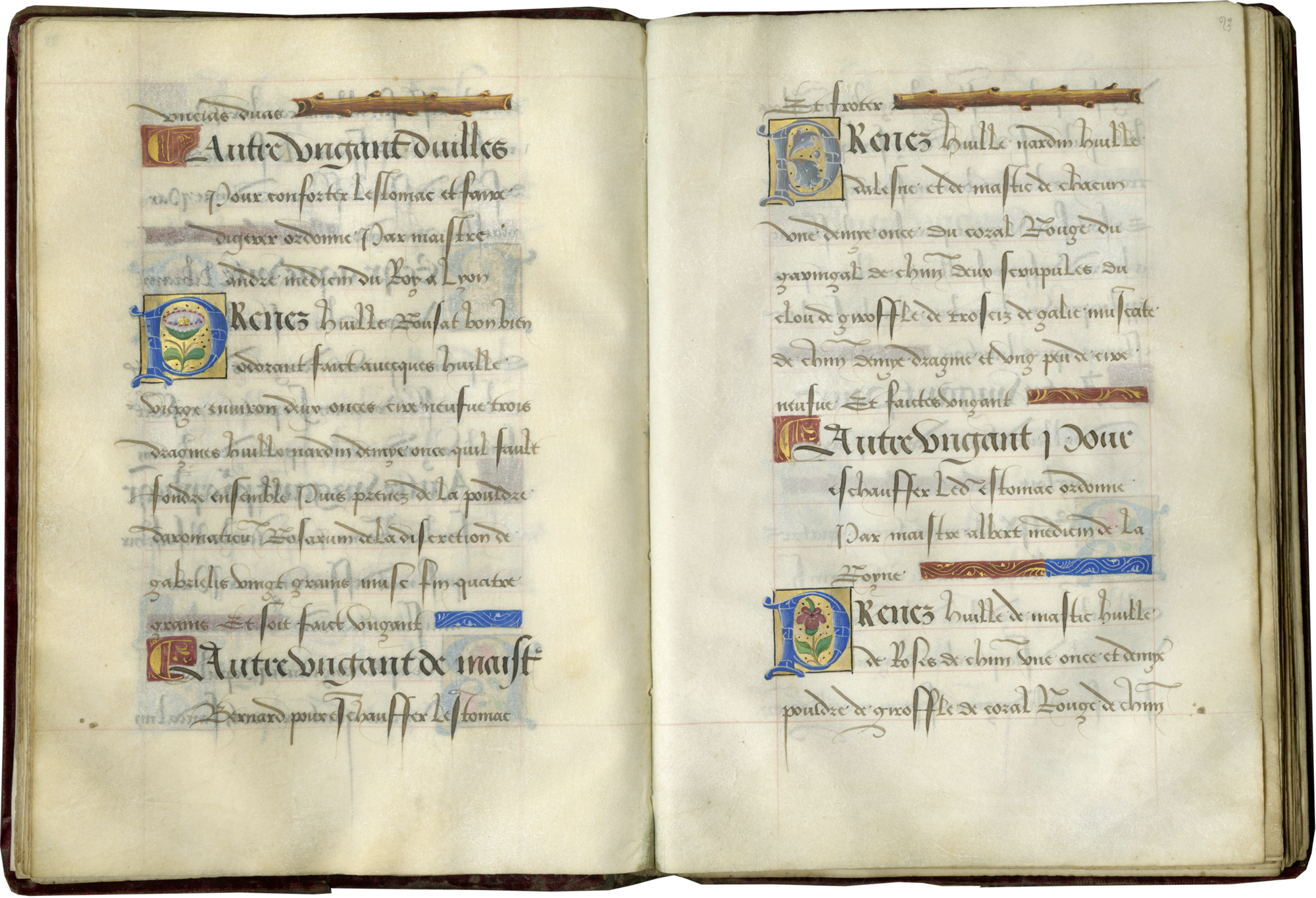 The entire text is in French (a notable point for a time when many academic medical texts were still circulated primarily in Latin), and most of the recipes are from contemporary physicians, rather than traditional sources from the past, including, among many others, François d’Allez and André Briau, doctors for the king of France. Many are ascribed to “Master Bernard,” who was almost certainly the Archbishop’s own doctor.
