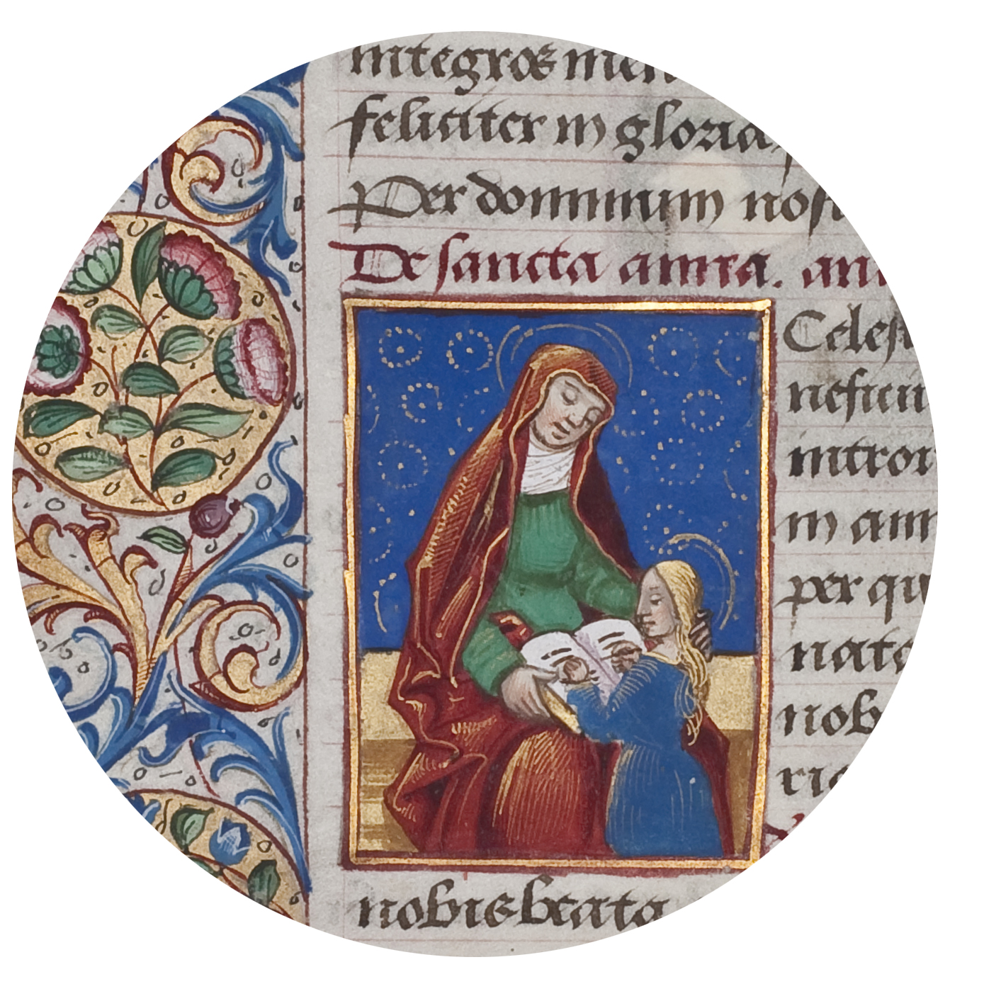 This charming miniature of Saint Anne teaching the young Virgin Mary how to read, painted by Guillaume II Le Roy, demonstrates one of the other important ways in which lay families used their Books of Hours (Use of Rome), BOH 46, France, Lyons, c. 1495-1510, f. 187v (detail)